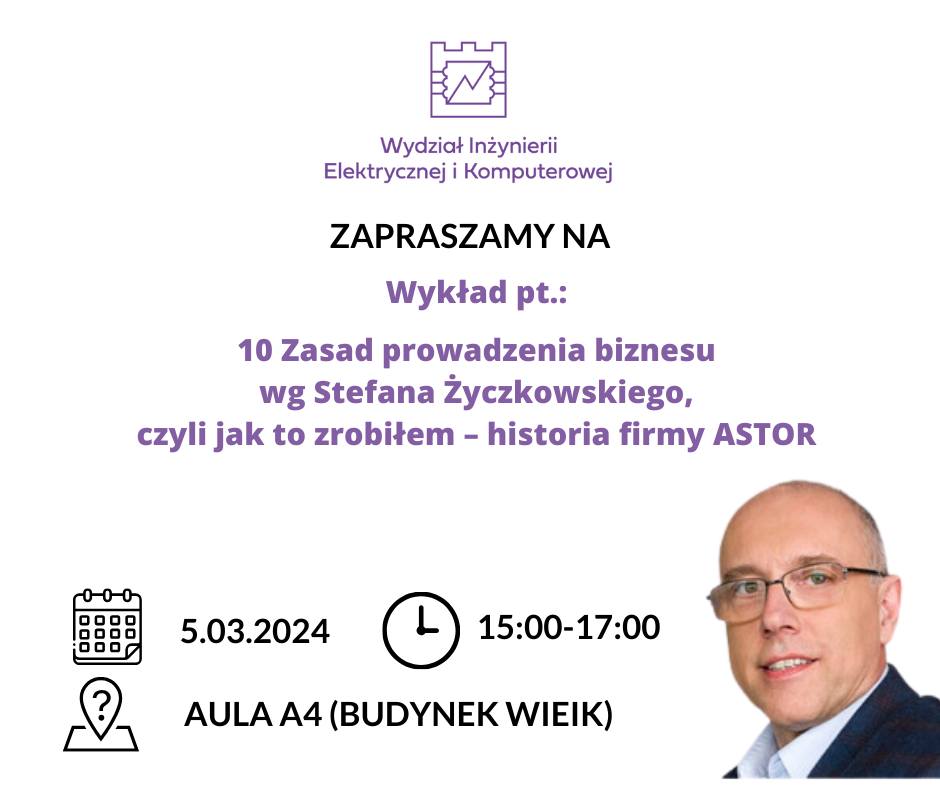 Wykład odbędzie się 5 marca 2024 w godzinach 15.00-17.00 w sali audytoryjnej A4 Wydziału Inżynierii Elektrycznej i Komputerowej PK